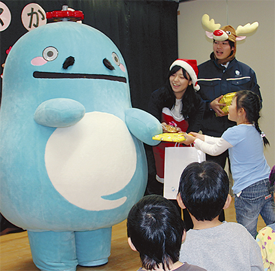 当日は同園のクリスマス会に合わせて行われ、(株)エネサンスのオリジナルキャラクター「エネさん」が、子ども達の代表に絵本をプレゼントした。突然のキャラクターの登場に、子ども達は大興奮。記念撮影なども行われた。