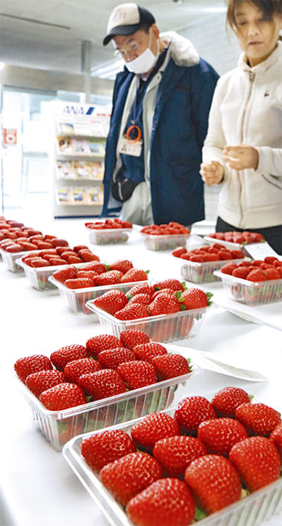 当日は、いちご部会の13農家から30点が出品された。審査をした県農業技術センターの普及指導委員は「気温の変化が激しく難しい栽培条件の中で、色・艶・粒のそろったイチゴが出品されました」とコメント。