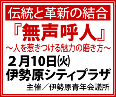 伊勢原シティプラザで2月10日(火)、講演会『無声呼人〜人を惹きつける魅力の磨き方〜』が開催される。時間は午後7時半から9時半まで。参加無料。主催は伊勢原青年会議所(中村直純理事長・39人)。