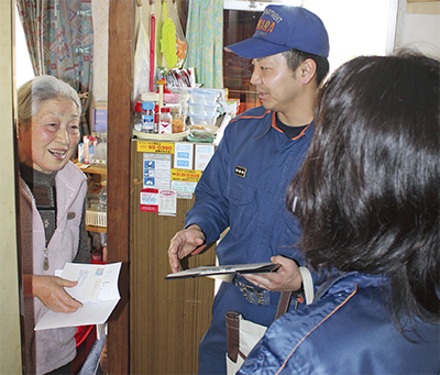 23日午後、消防本部予防課の越地修平さん(写真中央)たちは、上粕屋に住む古谷伊勢子さん(81歳)宅を訪問した。越地さんは、火の使用状況や消火器の有無などをくわしく調査したほか、時折、世間話を交えながら日常生活で感じる苦労や不安について本音を聞き出していった。