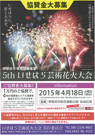 春の夜空を彩る「いせはら芸術花火大会」(主催/同実行委員会)が4月18日(土)、市総合運動公園自由広場で開催される。各種イベント・模擬店は午後1時から、打ち上げは7時を予定。「花火で伊勢原を元気にしよう」と市民有志が第1回大会を行ったのが2009年。震災などで開催が見送られた年もあったが、実行委員会が目標としていた5回目がいよいよ行われる。