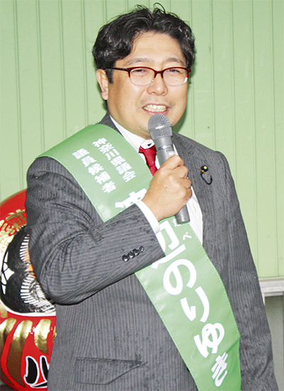 出陣式で渡辺氏は、将来のまちづくりにむけて国・県・市の連携によるインフラ整備が必要としたうえで「それには市議10年、県議2年半のキャリアで築いたパイプが役立つ」と話した。