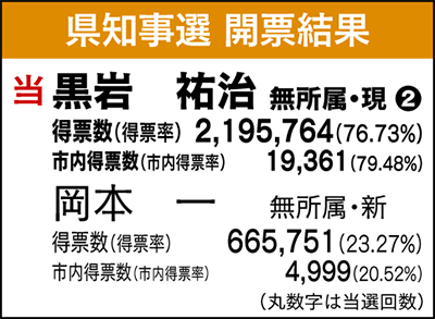 投票率は過去最低の40・71%。低投票率について黒岩氏は「県議選が11選挙区で無投票になったのが痛かった」と話した。
