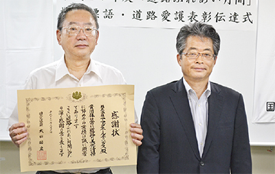 当日の伝達式には、同社総務人事部の服部忠信さんが出席。横浜国道事務所の杉崎光義所長は「道路愛護精神を長きにわたり引き継いでいただきたい」と挨拶し、感謝状を手渡した。