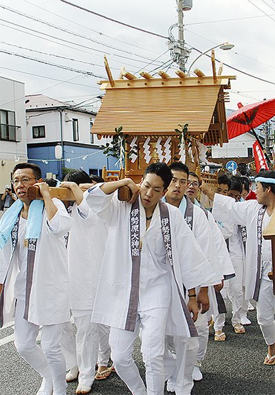 伊勢原の秋の風物詩のひとつとなる同祭、メーンとなる神輿渡御では宮神輿を中心に100人以上が参列し、勇壮な行列を見ようと多くの人が沿道に集まった。