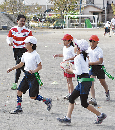 ラグビー界で長年活躍している村田亙氏(47歳)が10月27日・28日の2日間、市立成瀬小学校(能條公夫校長)でタグラグビーの授業を行った。村田氏は現在市内のグラウンドを練習の拠点にしている専修大学ラグビー部の監督。