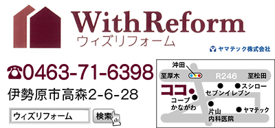 ヤマテック株式会社のリフォーム専門店「ウィズリフォーム」(高森2の6の28)は、おととし6月22日にグランドオープン。店は国道246号線「沖田」信号を入ってすぐ「With Reform」の看板が目印だ。