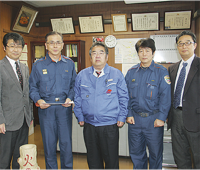 当日は岡部会長をはじめ、県LPガス協会の高橋宏昌常任理事、同北相支部の山田晶久副支部長も同席。新体制を説明した岡部会長は「火災現場で必要な対策をはじめ、何でも対応します」と挨拶。吉川消防長は「現場に早く到着していただけることはありがたい。ガスや電気は消防だけでは手に負えないものもある。よろしくお願いします」と話した。