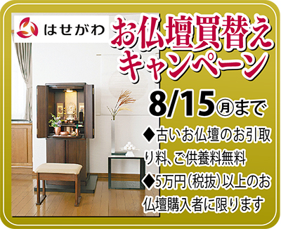 お仏壇の販売でおなじみの「はせがわ」では、厚木妻田店・平塚店・秦野店の3店舗合同で「お仏壇買替えキャンペーン」を開催中。