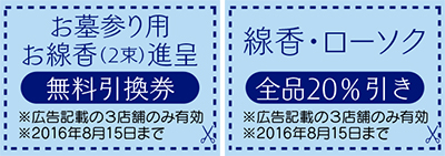 また、広告内のクーポンを持参すると、お墓参り用お線香(2束)が無料で進呈されるほか、お線香・ローソクが全品20%引きで購入できる。この機会にお近くの店舗を訪れてみては。(営業時間/10時〜18時半)