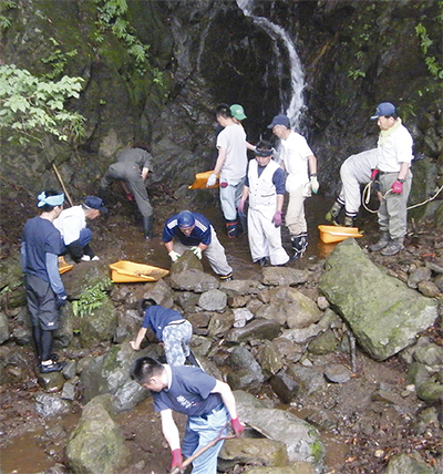 今回整備したのは大山阿夫利神社下社のすぐ下に位置する二重滝。この滝はかつて、大山を登る修験者たちの最後の禊の滝だったとされている。当日は、会員17人が参加し、大小様々な石を動かして積み上げ、滝壺を掘った。二重滝は狭い道沿いにあるため、整備用の重機が入らず、作業はすべて手作業で行われた。