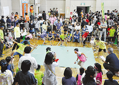 当日は、こまの回る時間を競う「寿命独楽」と的に投げ入れ点を競う「的独楽」の2部門を実施。大きな声援が響く体育館で、子どもたちによる真剣勝負が繰り広げられた。