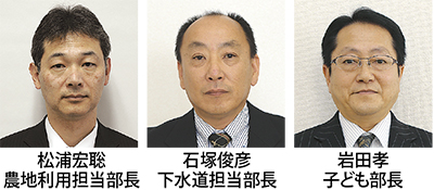 ▽佐藤一昭(経済環境部農地利用担当部長)▽吉野富夫(子ども部長)▽黒田繁(都市部長)▽飯野正樹(都市部参事(兼)政策調整担当課長)▽山口譲(教育委員会教育部歴史文化推進担当部長)