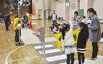 また、寄贈式後には早速、同所で交通安全教室が実施された。教室では市交通安全母の会が中心となって、児童に信号のわたり方などを指導。児童らは真剣に交通ルールを学んだ。