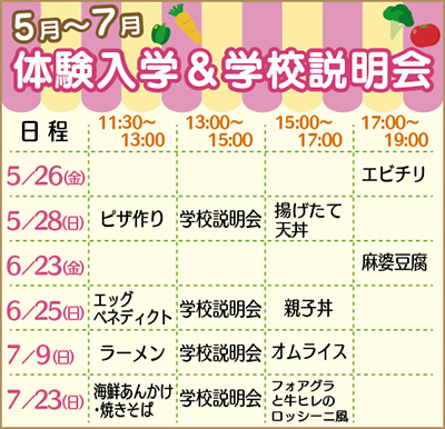 同校では5月下旬より順次、体験入学&学校説明会を開催。校内を見学できるほか、体験入学では調理実習も実施。講師のデモンストレーションの後、実際に料理を作り試食する。学びの場となる厨房に立つことで、より具体的なイメージを掴めるはずだ。