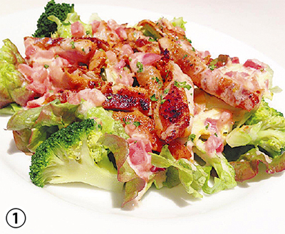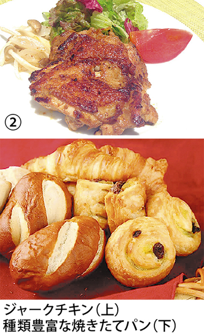 トマトやナスなど夏野菜がたっぷり入った『夏野菜のトマトカレー』は、トマトの酸味がアクセントになっているヘルシーで女性に嬉しいメニュー。このほか、ハワイのローカルフード『フリフリチキンサラダ』(写真【1】)や、スパイスとハーブがミックスされた奥深い味わいの『ジャークチキン』(写真【2】)もおススメ。