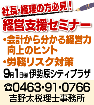 9月1日(金)には、毎年人気の『経営支援セミナー』を伊勢原シティプラザ中会議室で開催する。時間は午後2時半から5時まで(午後2時受付)。参加無料(懇親会参加者は別途2千円)。