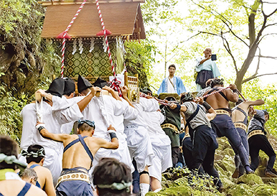 夏山が終わり、大山山頂へと続く登拝門が閉じられた大山。秋季例大祭は夏山の無事を喜び、大山中腹にある下社から神輿を町内におろし、大山6町(坂本町・稲荷町・開山町・福永町・別所町・新町)でもてなし、秋の豊作を願う伝統行事。祭りは、大山中興の祖と伝えられる権田直助初代社司の頃には、現在の形となっていたとされており、130年以上前から脈々と受け継がれている。