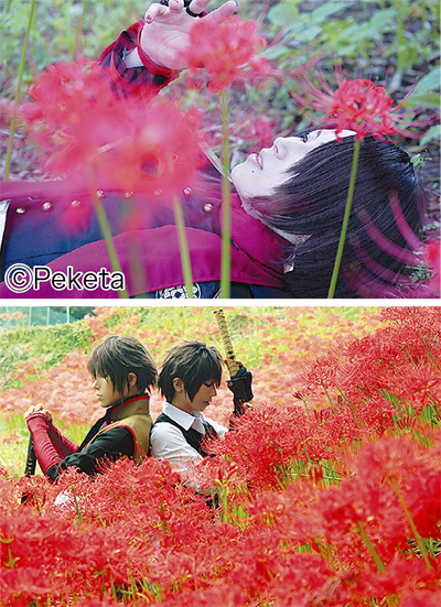 彼岸花の咲く時期にコスプレイヤーが集まるようになったのは3年前から。県内から訪れたグループは「地域の方々も協力的でロケーション最高。来年も撮影にきたい」と笑顔で話した。