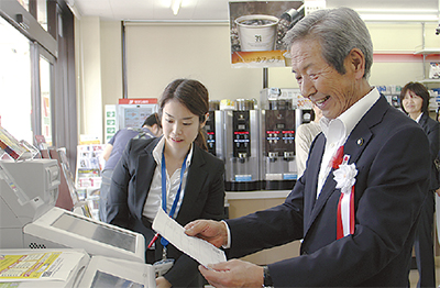 開始当日、セブンイレブン伊勢原田中店でオープニングセレモニーが実施され、高山松太郎市長をはじめ、関係者が出席。テープカットのほか、高山市長によるマルチコピー機を使った交付のデモンストレーション(=写真)も行われた。高山市長は「住環境も変化しています。利便性向上のひとつとして、ぜひ利用してほしい」と利用を呼び掛けた。