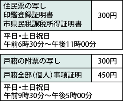 対象となる証明書は「住民票の写し」「印鑑登録証明書」「市県民税課税所得証明書」「戸籍附票の写し」「戸籍全部(個人)事項証明」の5種類で、本籍地戸籍証明書交付は県内初となる。手数料は300円〜450円と窓口交付と同額になり、市内約40店舗を含む全国5万カ所のコンビニ等でサービスを受けることができる。