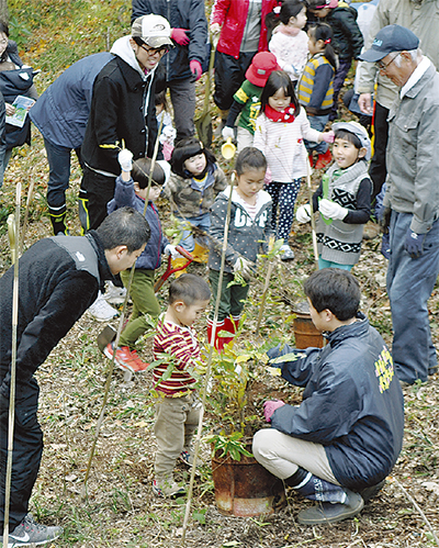 東海大学付属本田記念幼稚園の園児とその保護者らが12月2日、市総合運動公園裏の里山で植樹を行った。