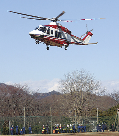 市内西富岡の成城学園伊勢原総合グラウンドで1月11日、県外などから消防防災ヘリの受入れを行う「緊急消防援助隊航空小隊受援訓練」が実施された。
