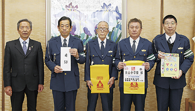 伊勢原交通安全協会(飯塚武彦会長)が3月7日に市役所を訪れ、市内小学校の新1年生全員分のランドセルカバーと交通安全クリアファイルなどを市に寄贈した。