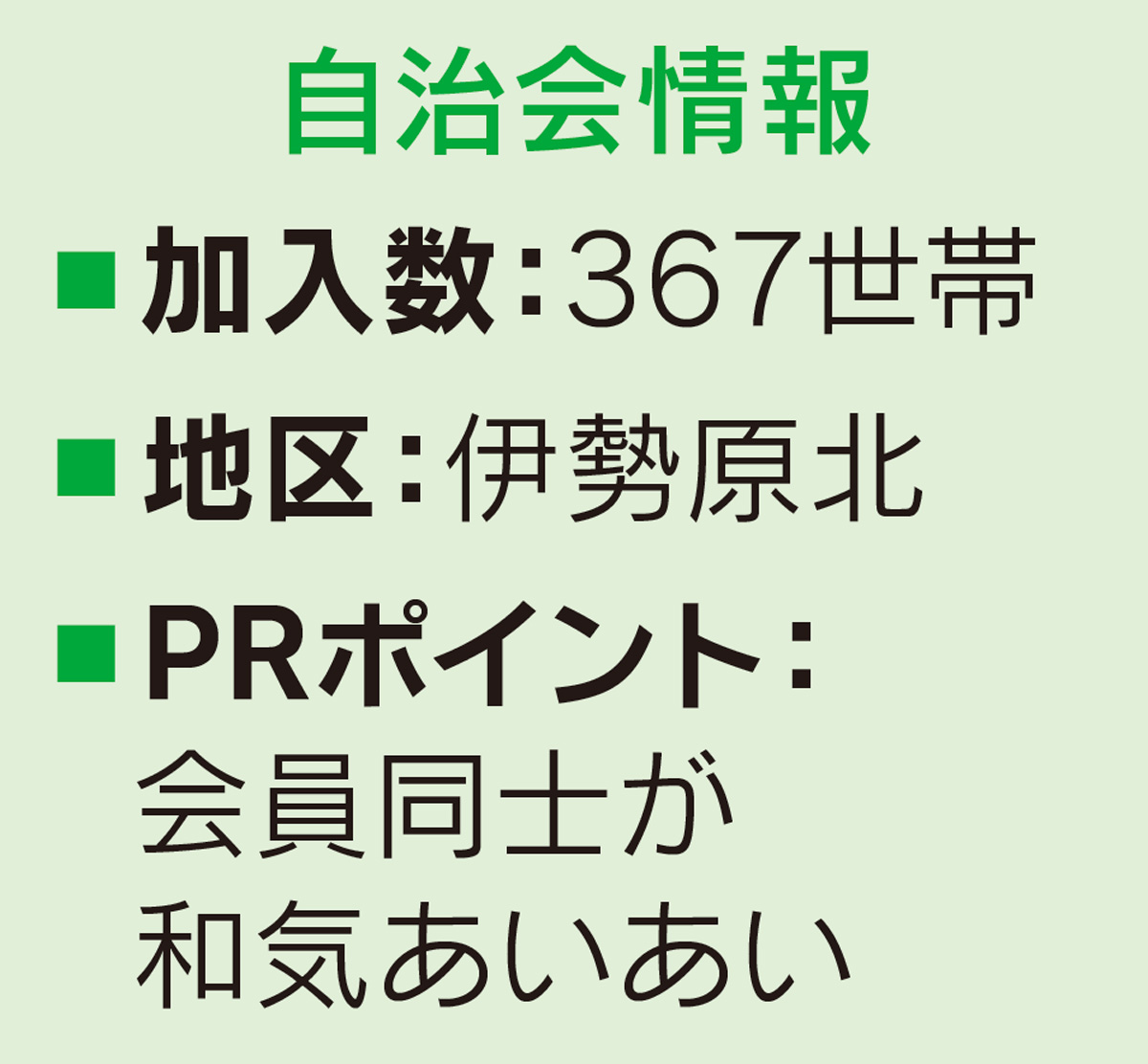 国道246号線、片町交差点付近を中心とする地区。一人暮らしの高齢者宅の訪問や防犯・環境美化パトロールなど地域の安全・安心を第一に活動している。「高齢者が多い地区なので親睦を深めるよう努めている。防災にも力を入れ、皆緊張感をもっている」と話す。