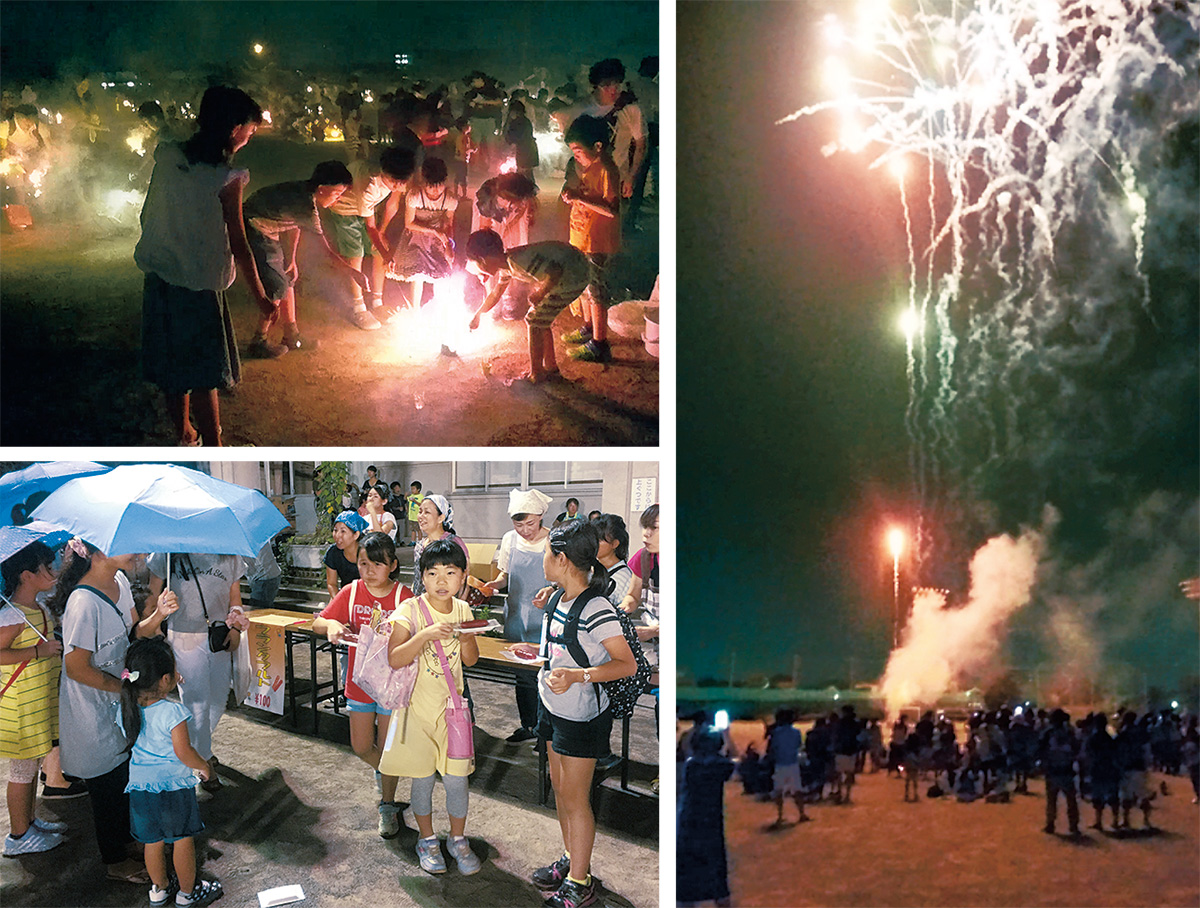 児童のみならず地域住民からも好評で、今回は20周年を記念した特別花火「仕掛け花火」も打ち上げられるという。花火の打ち上げは午後8時15分〜を予定(15分間)。そのほかプログラムは石田三種競技(午後5時〜)、模擬店(午後5時半〜)、おばけ屋敷(午後6時〜)、持ち込み花火(午後7時40分〜/手持ち花火に限る)となる。