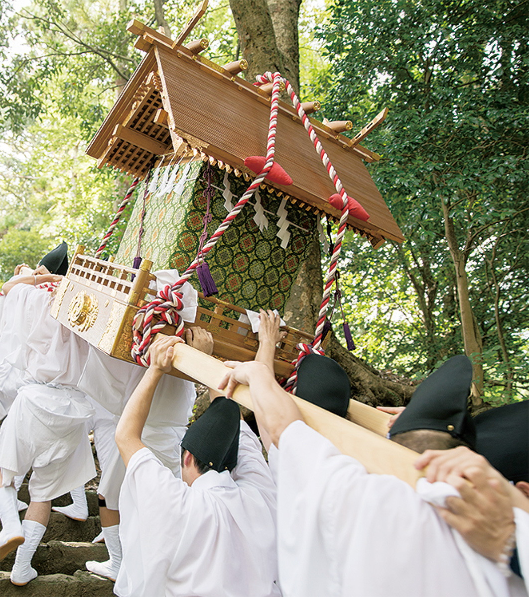 秋季例大祭は夏山の無事を感謝する伝統行事。27日は早朝に下社から神輿を担いで下る遷幸祭・通称「お下り」が行われ、150人を超える大行列が大山の6町を練り歩く。