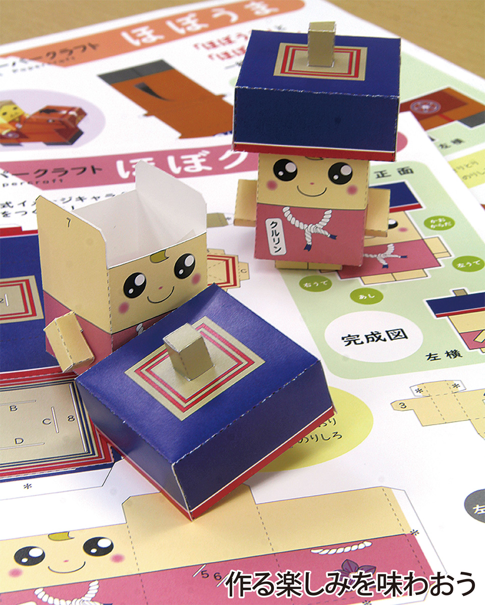 「よくできているでしょ」と話すのは同社の飯島大輔社長。クルリンや道灌など全4種類で、市観光案内所などで販売される。自身が子どもに作ったペーパークラフトを思い出し、商品にしたという。持ち帰ったペーパークラフトは約1時間で完成。頭のコマは実際に回すことも可能。気になる方は手に取ってみては。