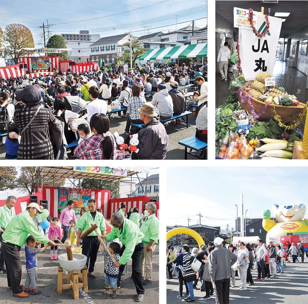 会場には市内JA各支部から集められた新鮮な農産物が並び、祭りスタート前に長蛇の列ができるほどの好評ぶり。メインステージでは、キャラクターショーや餅つき体験をはじめ、鼓笛演奏、ダンス発表などが行われたほか、本所内では恒例の農産物価格当てクイズや書道展示などもあった。