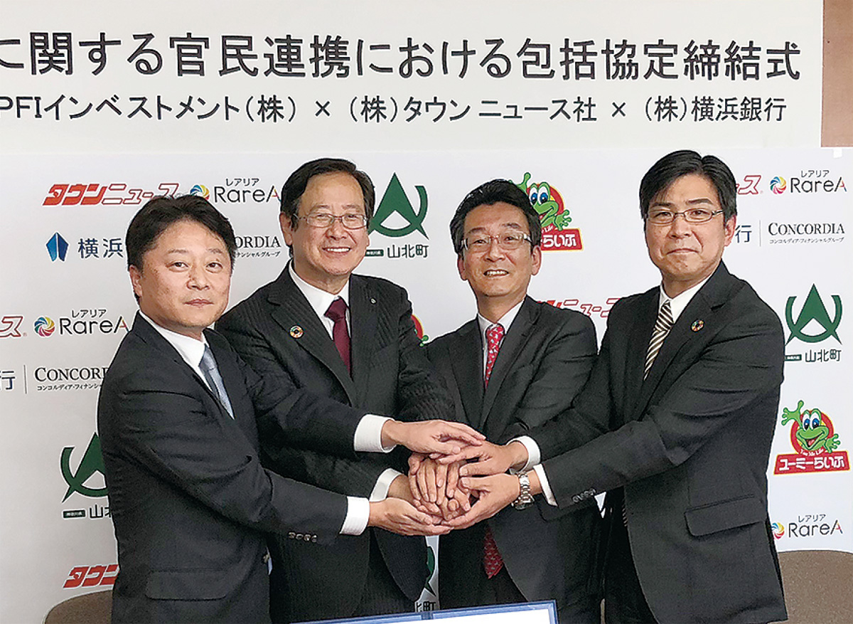 山北町(湯川裕司町長)とユーミーらいふグループの構成企業である日本PFIインベストメント(株)(西山和成代表取締役)、(株)横浜銀行(大矢恭好代表取締役頭取)、(株)タウンニュース社(宇山知成代表取締役)の4者が3月28日、山北町役場で山北町への移住・定住の促進に向けた官民連携のための包括協定を締結した。
