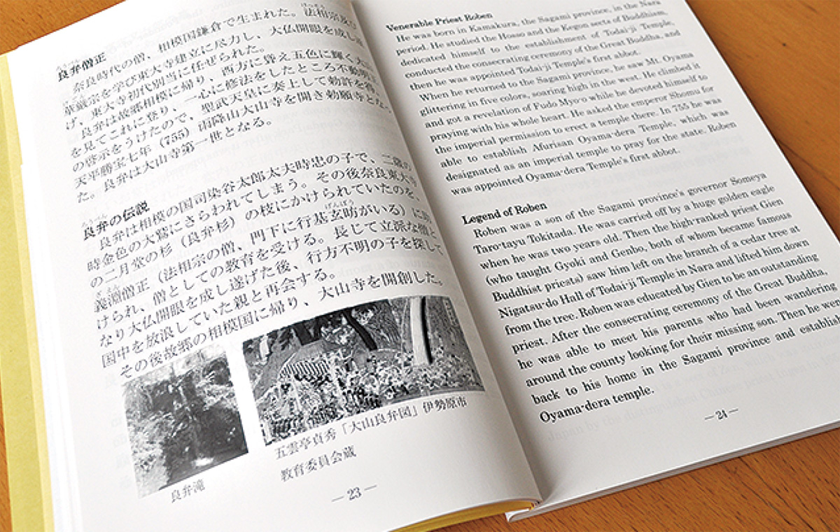 2015年にミシュラン・グリーンガイドジャポンで「大山阿夫利神社からの眺望」が2つ星を獲得したほか、2016年には「大山詣り」が日本遺産に登録され、外国人観光客が増加している大山。そうした中、同協会は市観光協会と連携して大山インフォメーションセンターで年間50日、観光ボランティアに協力。約1000人の外国人観光客に応対する中で「協会独自のガイドブックが欲しい」との声が上がったため、2年前に宮崎さんのガイドブックの英訳企画をスタート。市内在住で通訳案内業の石井久恵さんに英訳を依頼、文化庁の補助金を活用し、今年3月末に完成した。