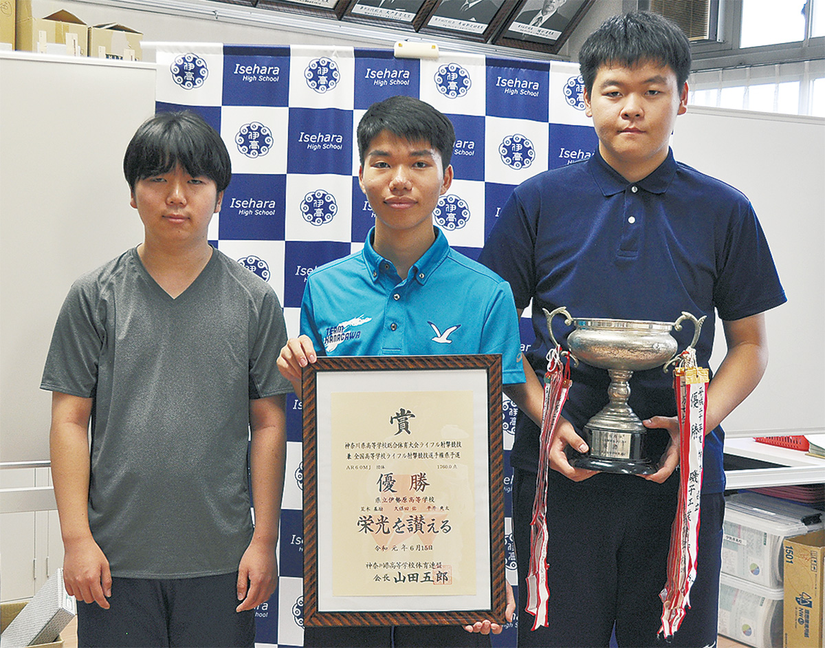全国大会に出場するのは、荒木基励さん(3年)、平井爽太さん(3年)、久保田佑さん(2年)の3人。6月に伊勢原射撃場で開催された県予選で好成績をおさめ、創部6年目にして初の団体戦で全国大会出場を決めた。
