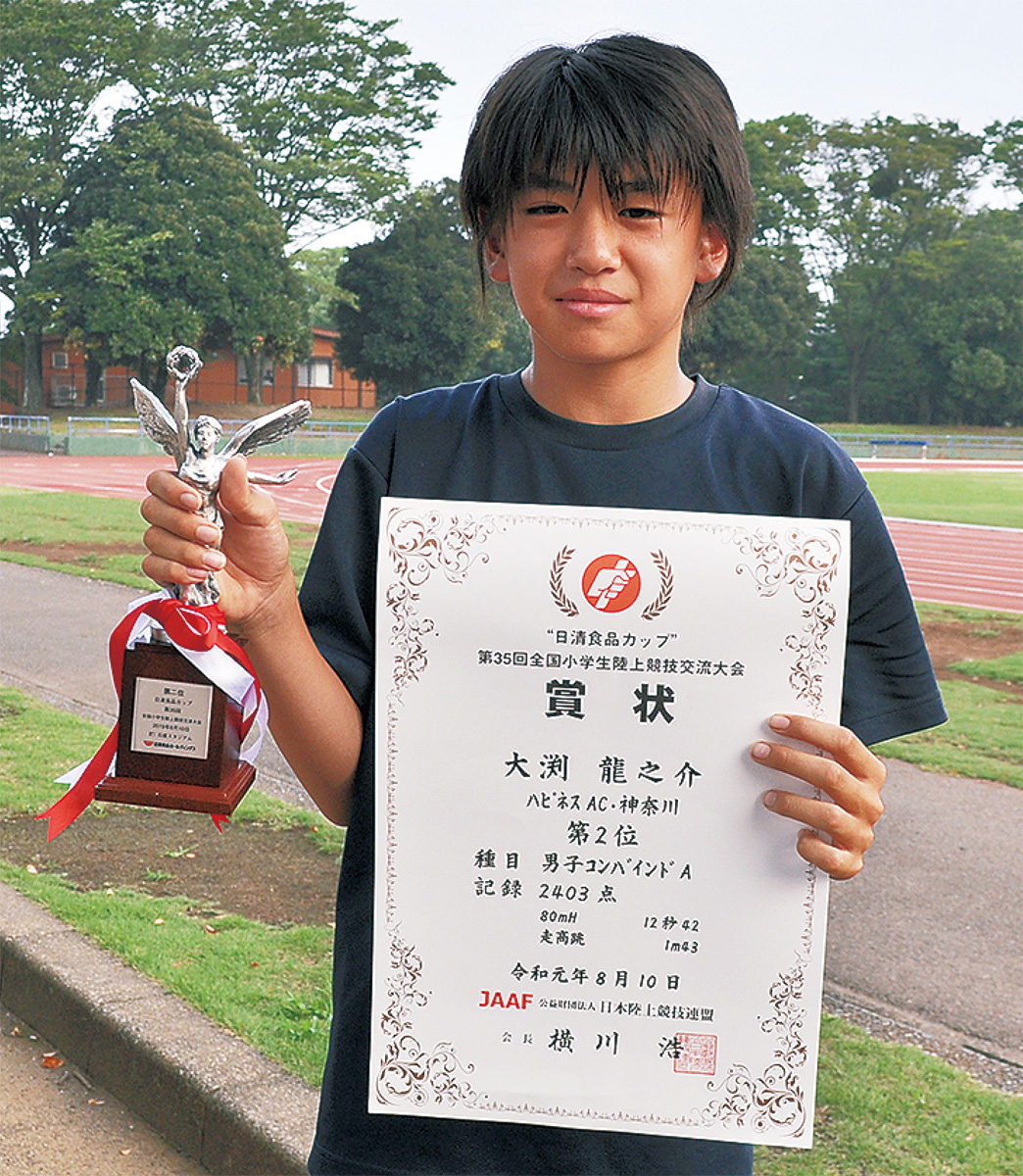 第35回全国小学生陸上競技交流大会が、8月9日、10日に横浜市の日産スタジアムで開催され、コンバインドA(80mハードル+走高跳)種目に神奈川県代表で出場した、大田小学校6年の大渕龍之介さん(Happiness AC所属)が準優勝に輝いた。