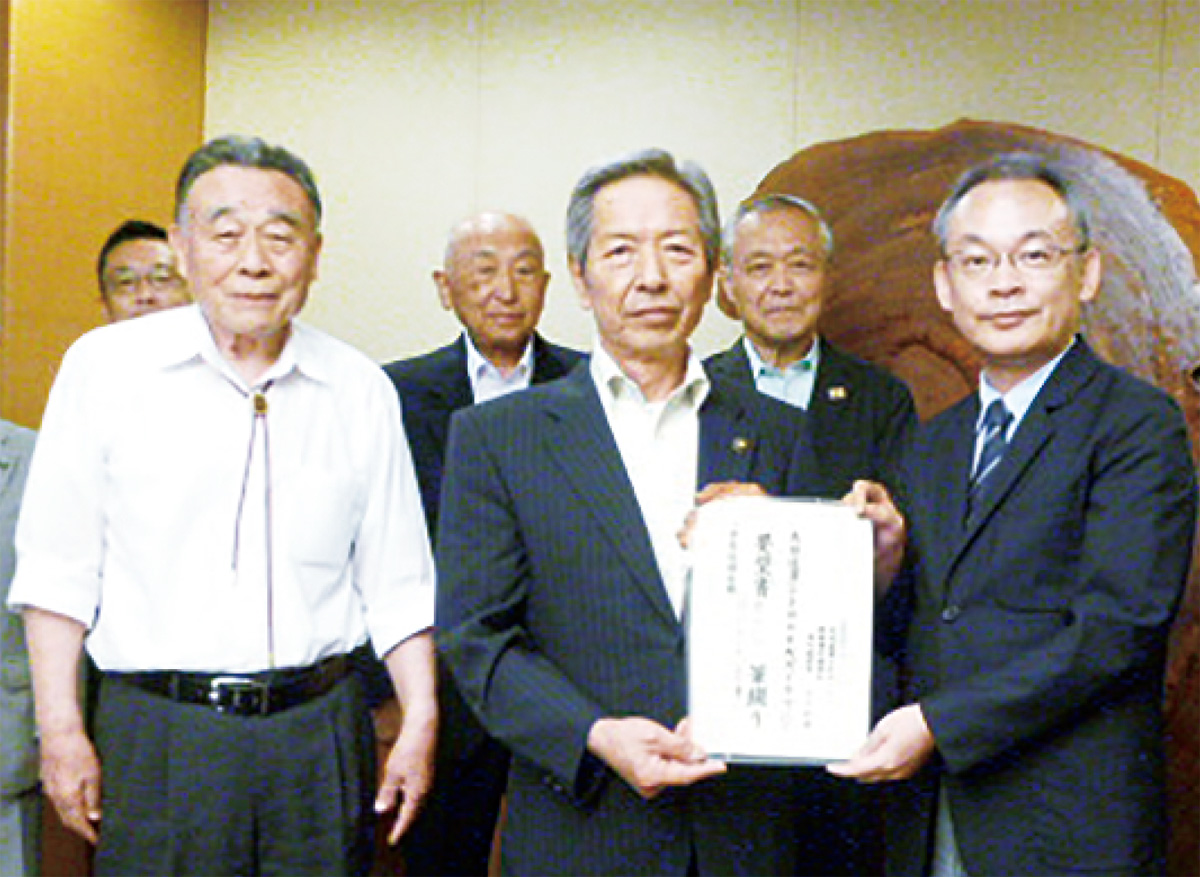 4回目となるこの日の陳情には、三上会長や高山松太郎伊勢原市長のほか、道灌にゆかりのある関係団体などから27人が出席。同委員会が中心となって集めた21万筆の署名を、高山市長が佐藤制作局長に手渡した。