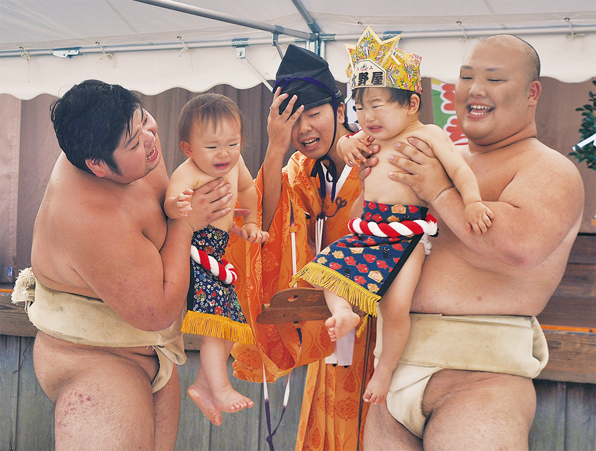 泣き相撲は、赤ちゃんが元気に泣くことで健やかな成長を願う神事。泣き声が邪気を払うとされ、400年以上歴史があるといわれている。