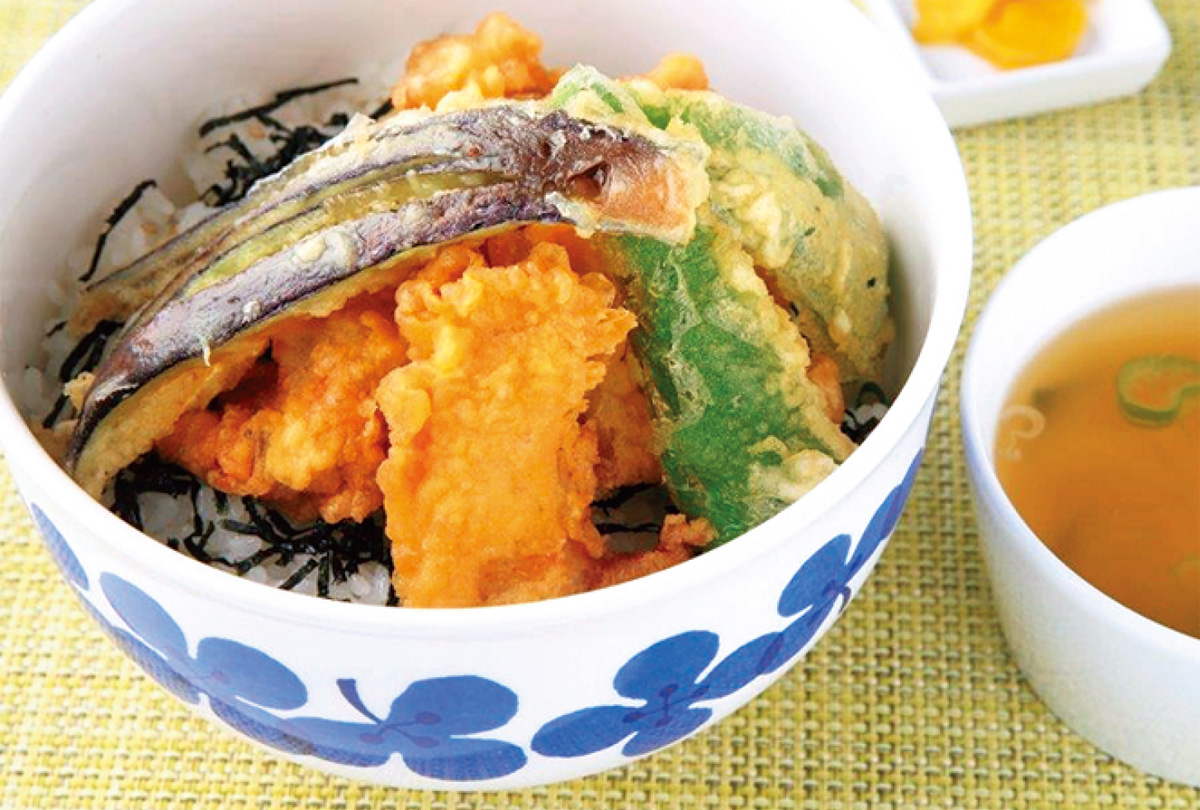 『日替わり丼』は全14種類。一番人気の「とり天丼」は、しっとり柔らかい鶏肉と自家製甘辛ダレでご飯がすすむ一品(みそ汁と漬物付)。『日替わりうどん・そば』は、カレーうどんなど全8種類。ご飯かサラダが付き、プラス300円(税込)でミニ丼の注文も可能。