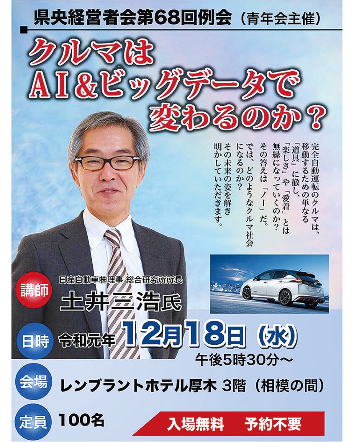 その疑問に答えてくれる講演会が12月18日(水)、レンブラントホテル厚木3階相模の間で開催される。主催は県央経営者会(大泉政治会長、会員数200社)。講師に日産自動車(株)理事で総合研究所所長の土井三浩氏を招く。講演テーマは「クルマはAI&ビッグデータで変わるのか?」。