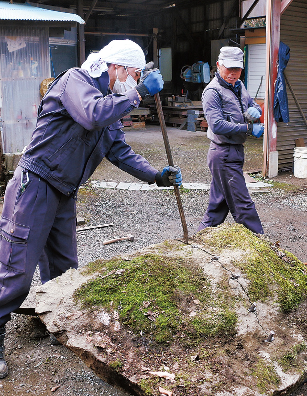 市内日向地区で、およそ50年前まで採石されていた「日向石」の産業を復活させ、歴史や文化を後世に伝承する民間のプロジェクトがスタートした。1月19日には、日向石の原石を搬出し、石を割って中心部を調べる作業が行われた。