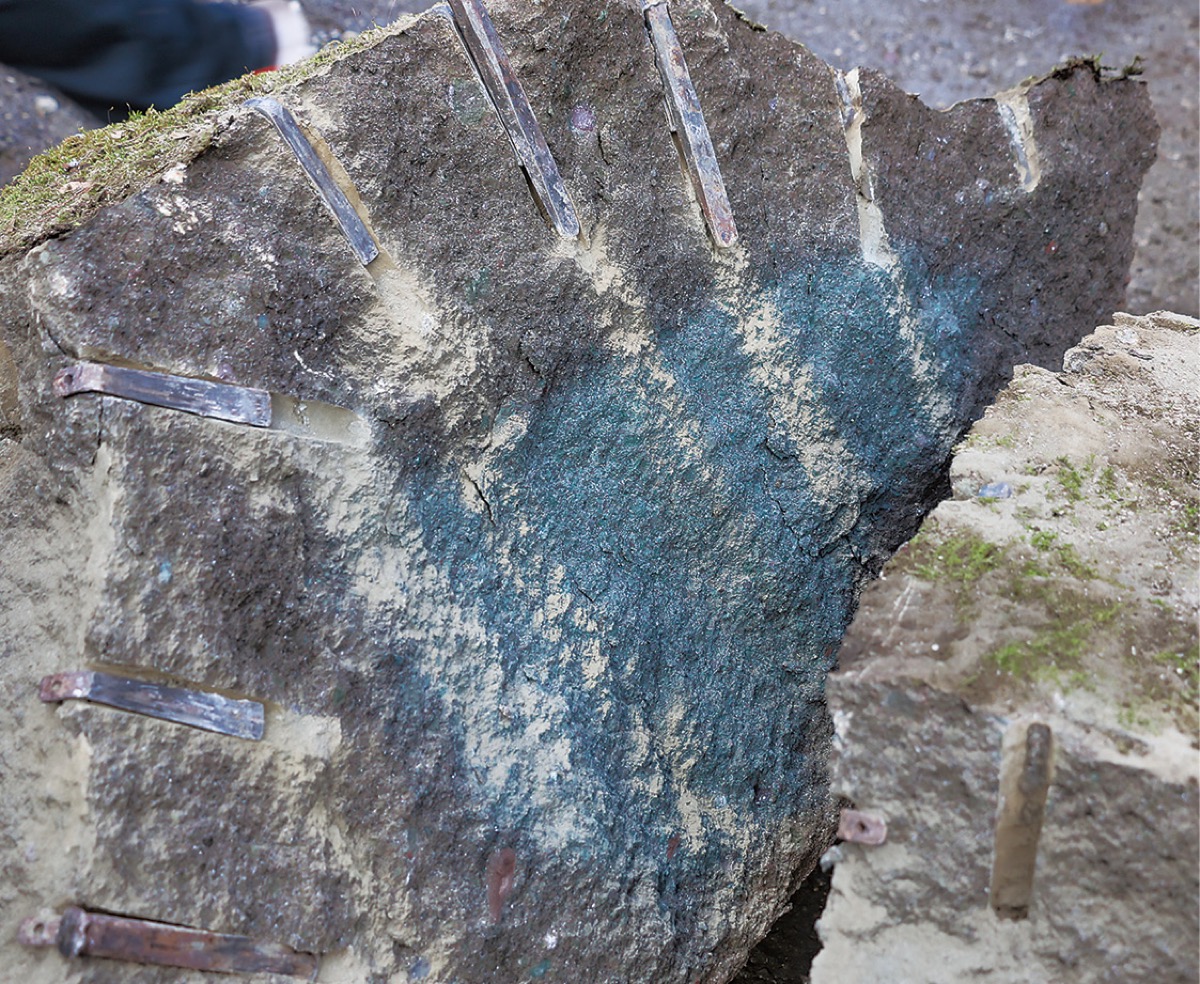 日向石は別名、「相模青石」とも呼ばれていたほど、中心部が青い石だった。1月19日に行われた調査には2人のほかに、成瀬さんの父・徳春さん(71)や石の研究者らも参加。縦約1・5m、横約1・2m、厚さ約45cmある約1・3tの原石を搬出して割り、芯が青いことを確認した。