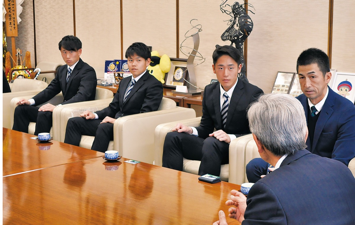 入団発表に先立ち3人は監督と共に伊勢原市役所を訪れ高山市長を表敬訪問。入団報告とともに、プロでの活躍を誓った。高山市長は「ケガに気をつけていずれJ1の舞台で活躍し、日本代表を目指して頑張って」とエールを送った。