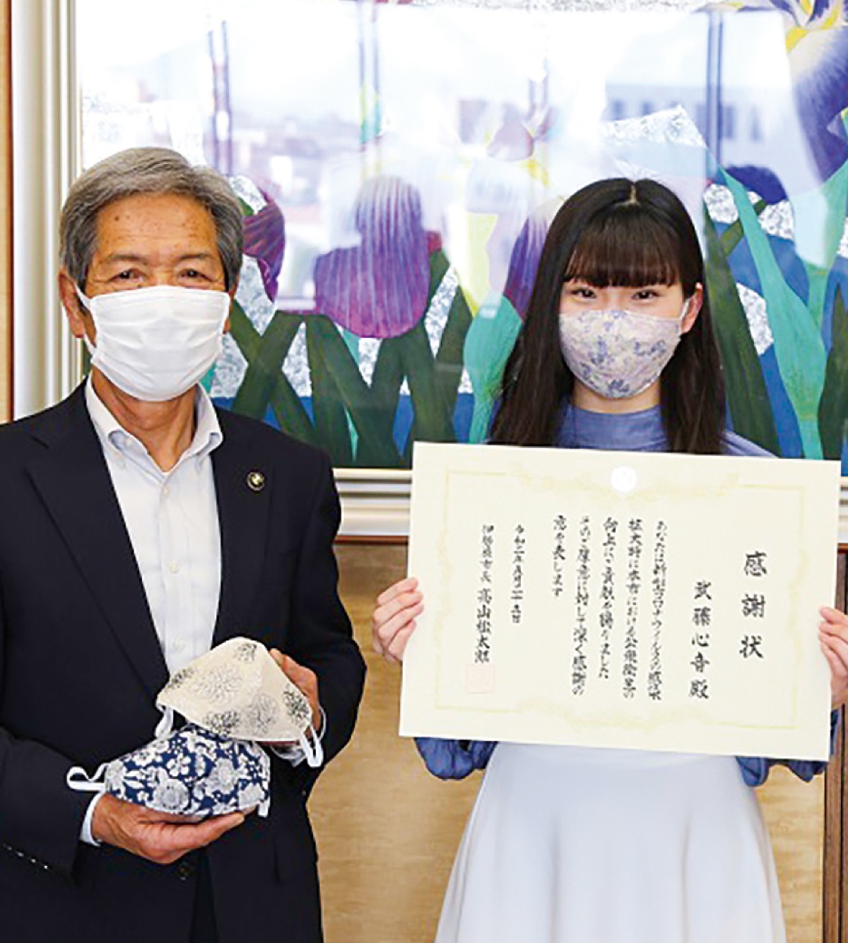市内在住の武藤心音さん(高校3年)が5月25日、手作りマスク80枚を市に寄贈した=写真。