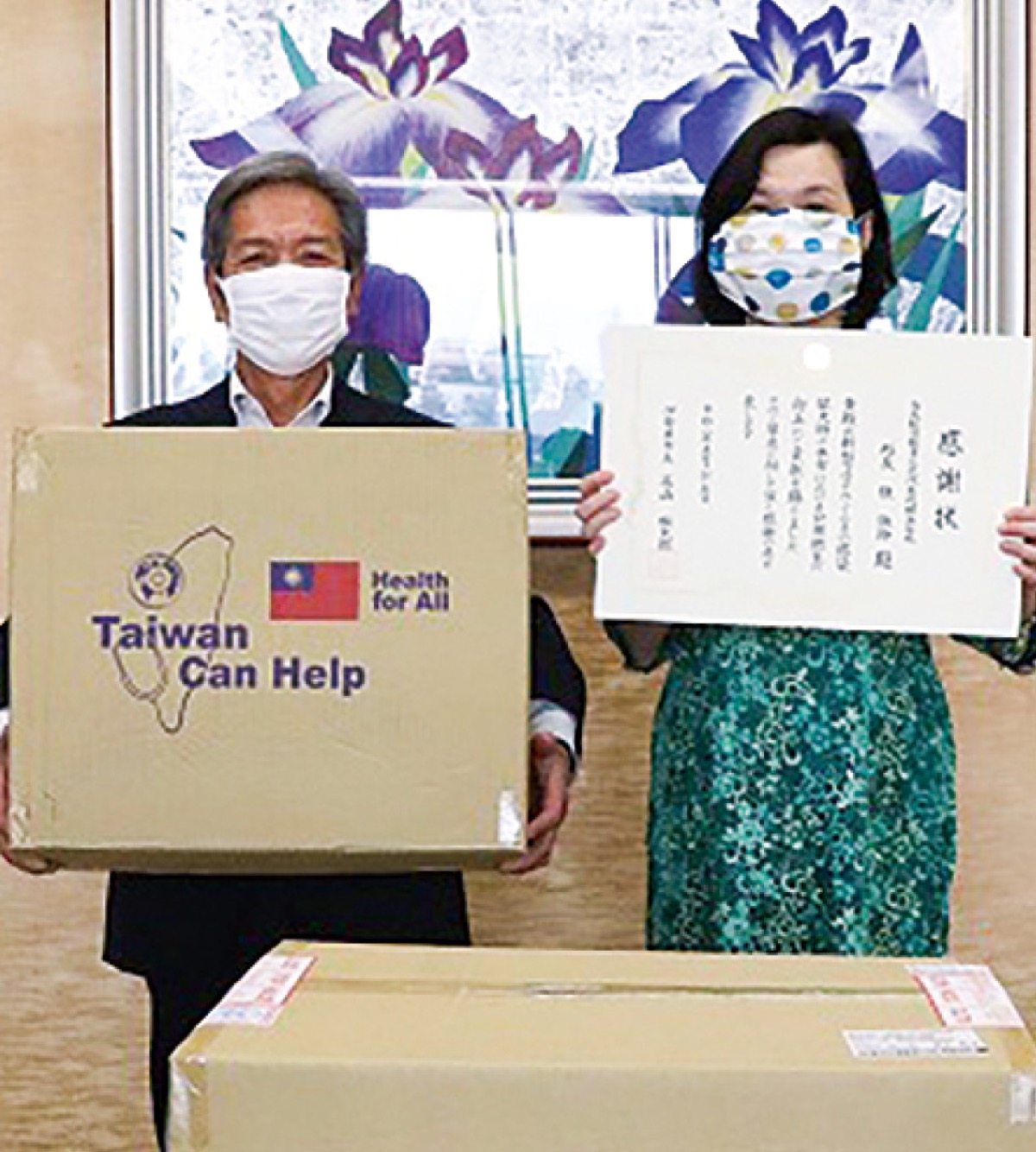 台北駐日経済文化代表処横浜分処の張淑玲処長が5月25日、伊勢原市役所を訪れ、台湾製のサージカルマスク1万枚を市に寄贈。高山松太郎伊勢原市長に手渡した=写真。