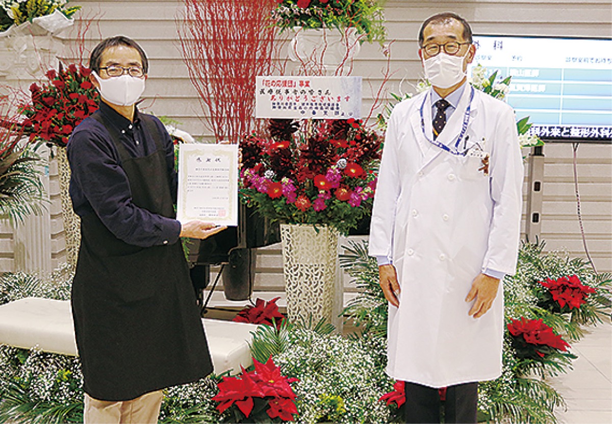 この日は感謝状の贈呈式も行われ、鎌田病院長から同支部の加藤昇支部長に感謝状が贈られた。鎌田病院長は「素晴らしい贈り物を頂き、ありがとうございます」と話した。加藤支部長は「地域医療を支えてくださっている皆様に心からの感謝をしたい。花で気持ちを落ち着かせてもらえれば」などと話した。