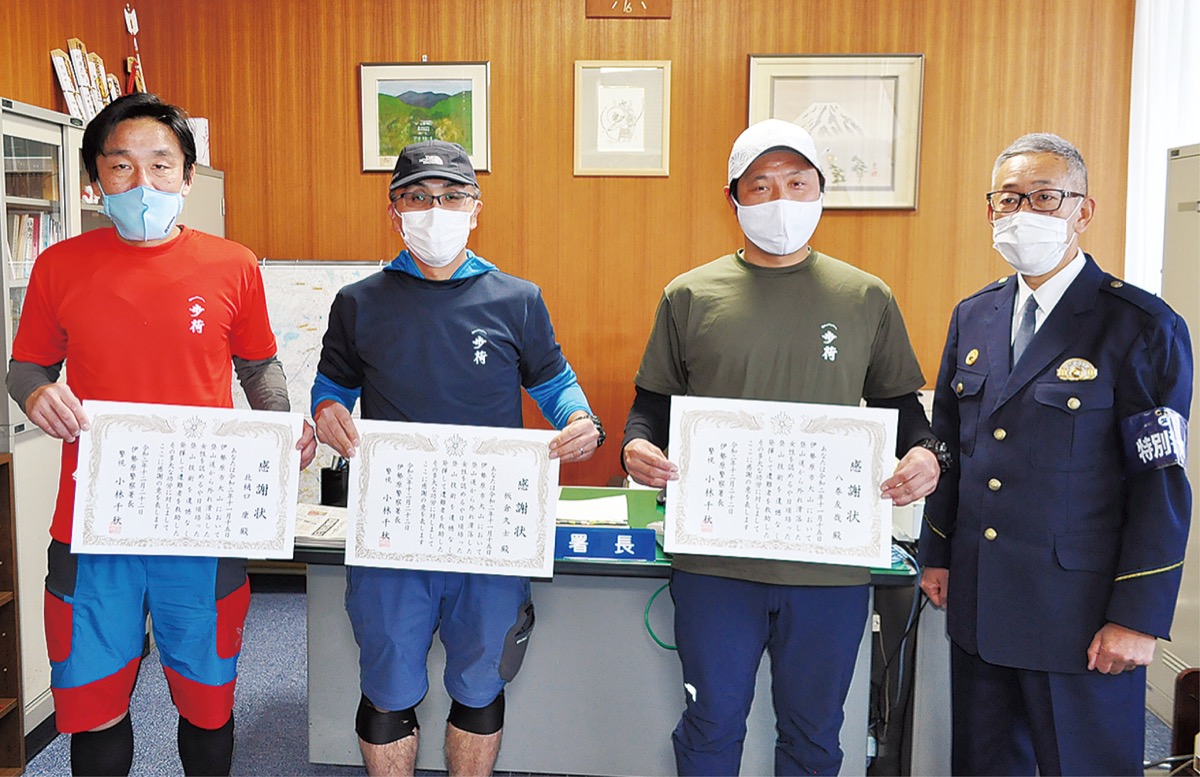 感謝状が贈呈されたのはボランティアで大山を訪れた北樋口康さん(53)と、登山で訪れた板倉久士さん(44)、大山阿夫利神社下社近くの飲食店で働く八巻友哉さん(39)の3人。