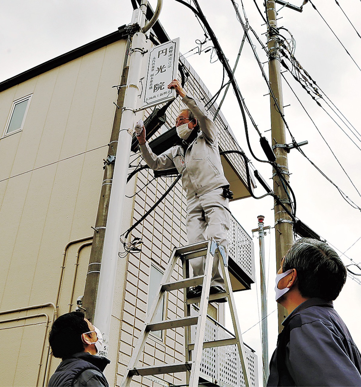 同会は通行人の夜間の安全確保のため同地区内59カ所に40年ほど前に街路灯を設置。加盟店が電気代を負担し、維持管理を行ってきた。今回の作業で59カ所ある街路灯のうちの31カ所に看板の設置を完了させた。