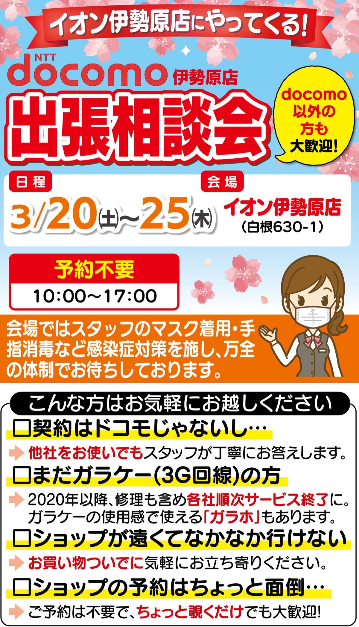 ドコモショップ伊勢原店が3月20日(土)から25日(木)まで、イオン伊勢原店1Fサービスカウンター前で出張相談会を開催する。時間は午前10時〜午後5時まで。予約不要で来場自由。ドコモユーザー以外も相談可能。